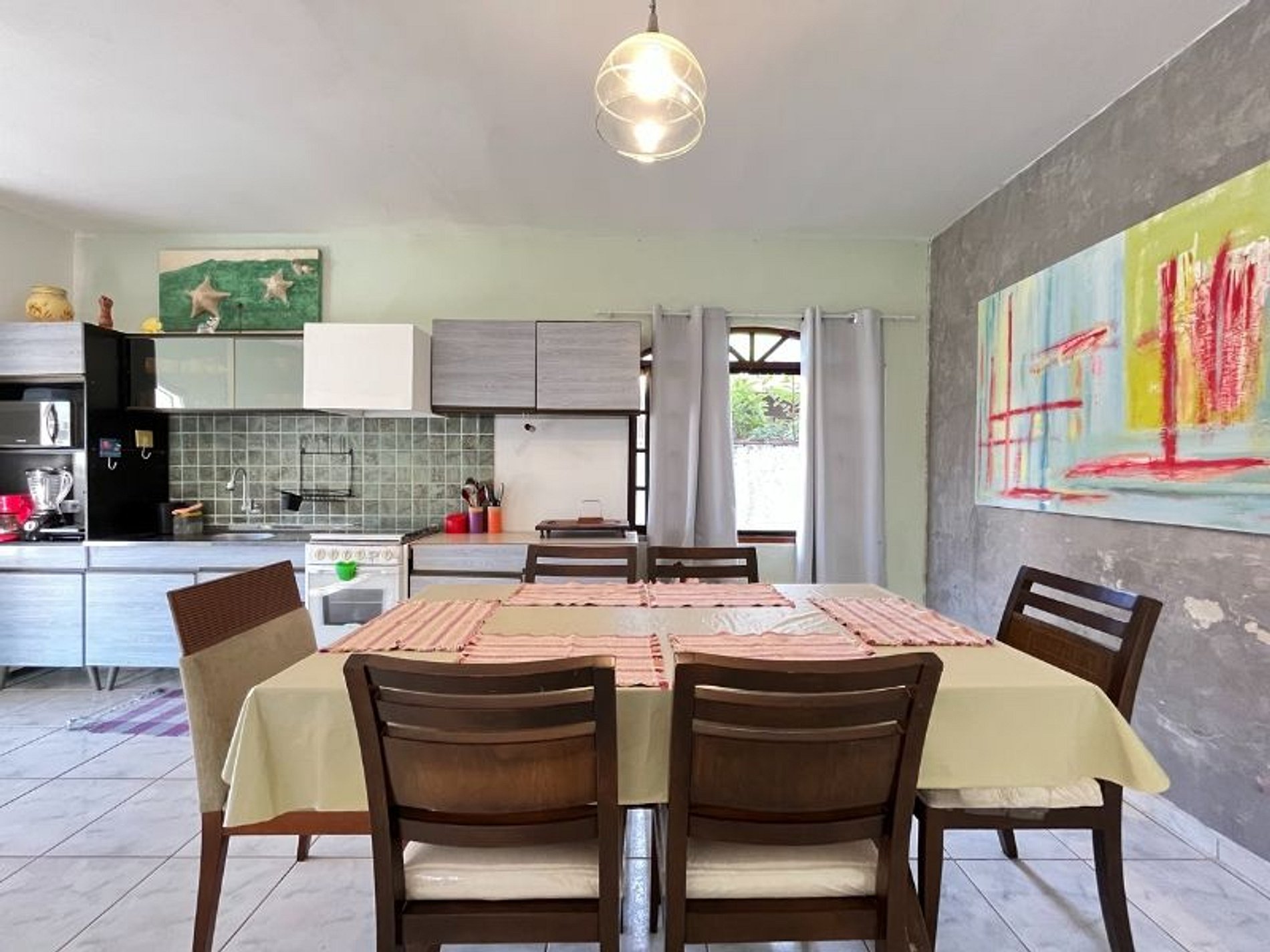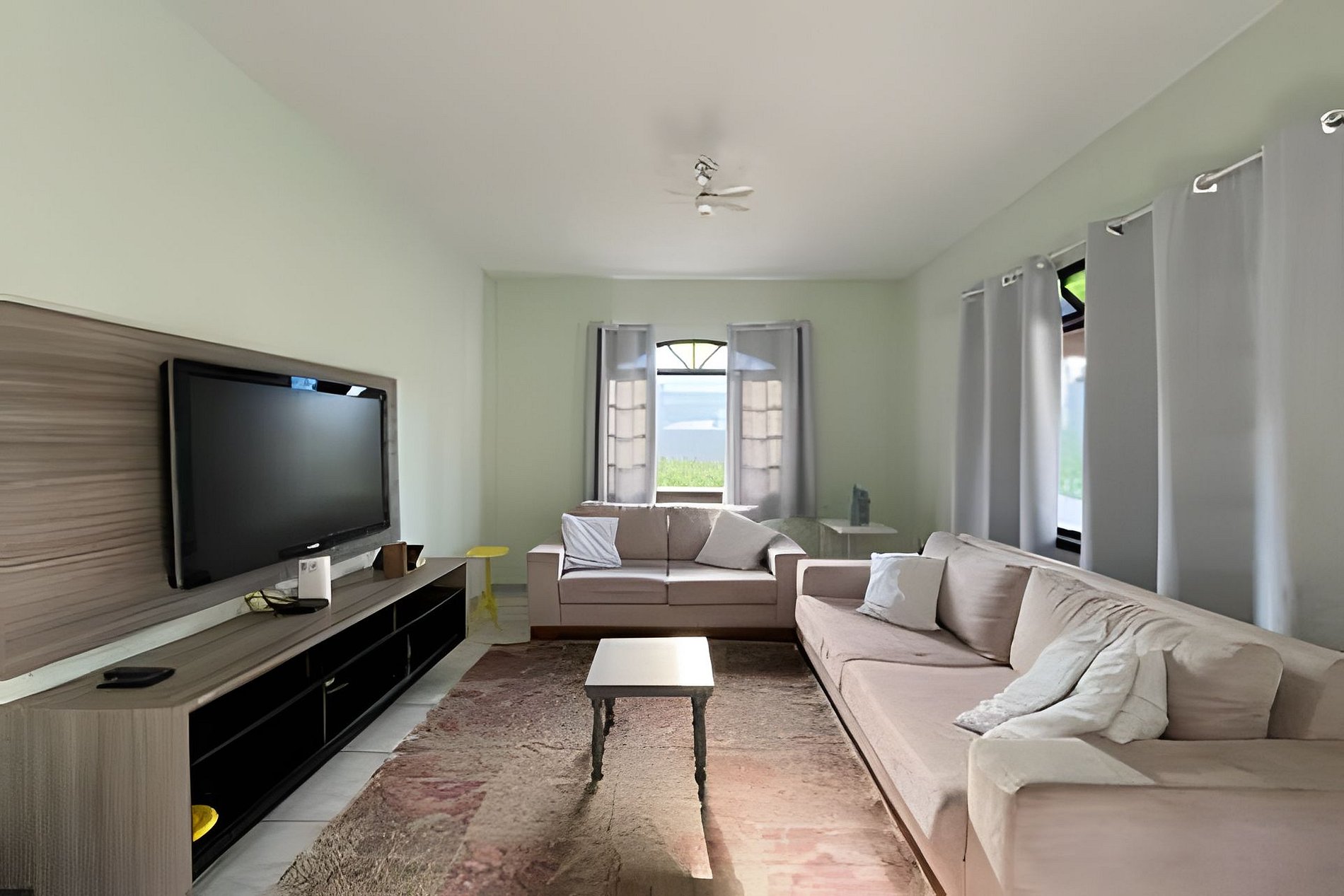 -Churraqueira de concreto -Tv 49'' Vários canais adultos e infantis -WIFI -Ducha Externa -2 Quartos com ar cond -Sala de estar ampla -Cozinha completa *Fogão e forno a gás * Microondas * Liquidificador *Sanduicheira *Cafeteira *Geladeira frezzer *Banheiro *Quintal grande e aberto com muro baixo, Rua sem saída.
