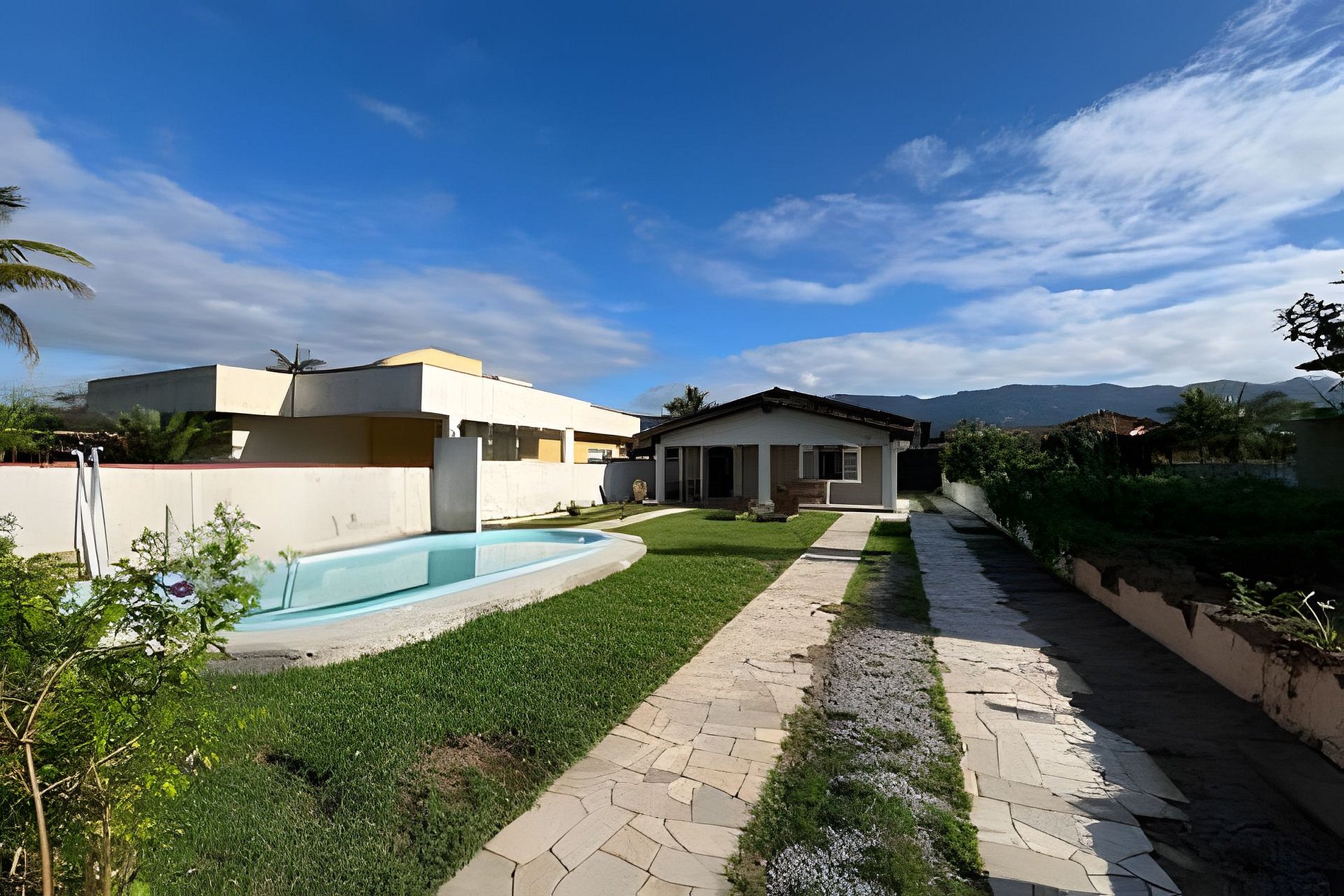 O terreno possui 500 m², com uma casa de 90 m² e uma piscina localizada em frente à residência.